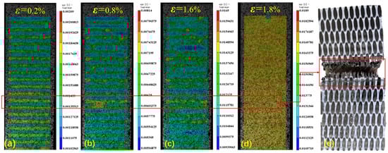 In order to characterize the corresponding strain response, full field strain maps at strain levels of 0.2%, 0.8%, 1.6% and 1.8% are shown in Figure 5a–d, respectively. Observed surface strain distribution coincides with previous studies [,]. High strain concentrations in the matrix material were found during the tensile process. Moreover, this localized higher strain, with the corresponding damage experienced by the surface matrix material, partially contributed to the bilinear stress–strain response. At a strain level of 0.2%, one can observe that the surface strain field demonstrates an array map with higher and lower strain areas distributed in accordance with the surface topology shown in Figure 5e. Along with the tensile process, the surface strain distribution evolves gradually to a less regular map, due to the strain concentration of the matrix material. Moreover, the highest strain concentration area demonstrated in Figure 5b–d was located in the same position and resulted in the final tensile fracture (Figure 5e). In other words, the DIC monitoring of the full field strain distribution gives valuable information not only for a reliable homogenized Young’s modulus but also for the material fracture behavior.