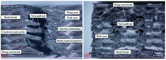 Typical morphology of the tensile fracture surfaces is shown in Figure 6. Failure mechanisms were found to be repeatable among the tested samples. Observed failure modes in the 3D woven composites coincide with a previous study by Tan et al. []. Fracture planes were identified along the weft yarns accompanied by matrix/yarns debonding. Warp yarns pull-outs were seen leaving yarn-holes on the inner fracture surface. Longitudinal warp yarn cracking was found on the front surface of the evaluated samples. Matrix cracking was present in the surrounding composites parallel and adjacent to the warp and weft yarns. However, warp yarn breakages at the global failure location were found to be the primary failure mechanism.
