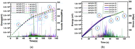 According to the contrast analysis of the typical AE energy curve with the tensile load curve on Figure 7, high-energy AE signals showed up throughout the whole tensile process, from the early linear stage through the inflection point to the load reduction moments during the second linear part. As shown in Figure 8a, tensile tests of five specimens showed a good repeatability of the aforementioned observations. Based on the consistency of the experimental phenomena, one can scheme the phased experiments into at least 3 phases using the real-time AE energy monitoring method. To explore more details of the damage evolution process, the authors planned and completed five-phases tensile tests, using specimens from sample-06 to sample-10, with the first phase point at the early linear part, the second at the inflection point, the third and the fourth at the second linear part, while the fifth phase point was set just before the final tensile fracture. All the five phase points were set at the instant moment when a high-energy AE signal showed up. Results of the five-phases experiments are demonstrated in Figure 8b. The five-phases tests were manually stopped at the stress levels of 28.81%, 65.98%, 72.93%, 78.14% and 89.20% σs, respectively, with the damage degree increasing and accumulating in turn, according to the AE energy curves. The correspondence between the phased samples and the stress levels is shown in Table 3.