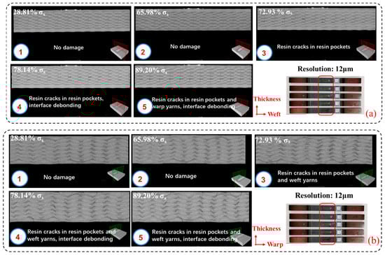 Figure 9 shows the CT cross-sectional pictures of the five phased samples along the warp (a) and weft (b) directions, respectively, with a maximum possible resolution of 12 μm. The displayed pictures correspond to a same area of interest in the five specimens. At the first and second phase points (stress levels of 28.81% and 65.98% σs, respectively), no damage was observed in the specimens (Figure 9①,②). Resin cracks were detected in the observation plane at the third phase point (Figure 9③), corresponding to a stress level of 72.93% σs, indicating that detectable damages showed up firstly during the stress range of 65.98%–72.93% σs. From Figure 9a,c, one can see that, at this phase point, these resin cracks mainly distribute in the resin pockets, while some resin cracks also appear in the weft yarns, according to Figure 9b. These cracks grew wider and longer at the last two phases with higher stress levels of 78.14% and 89.20% σs, respectively. Another damage mode of interface debonding was detected at the last two phases (Figure 9④,⑤).