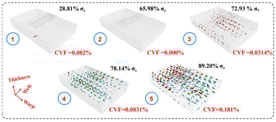 Figure 10 demonstrates the 3D reconstruction of inner cracks of the five phased specimens. The quantification analysis of the damages was performed using the VG Studio Max 3.3 (Monterrey, Mexico). In each 3D representation, the damage voxels were separated from the yarns and the matrix voxels according to the various grey levels of materials and voids. Obtained results cannot be used as absolute values. However, the crack volume fraction (CVF) measured in this study is proportionally affected by the number and size of the cracks and can be used to characterize the damage level of each specimen. The CVF represents the ratio between the volume of inner cracks and the total detected volume. No cracks were detected at the first two phases. Up to the stress level of 72.93% σs, the cracks can be detected with a random distribution in the specimen. Cracks propagated and new ones appeared at the last two phases due to higher stress levels. The CVF for the five phased specimens is 0.002%, 0.000%, 0.0314%, 0.0831% and 0.181%, respectively. In accordance with the observations on Figure 9, the damage volume increases and accumulates in turn within the maximum applied tensile stress. However, one abnormal datum was found; at the stress level of 28.81% σs, the CVF value is offered by the artifacts, not by the damages. Artifacts have different geometric morphology, compared with the inner cracks, and no artifacts were found in the other four phased specimens. No cracks can be seen until the third stress level, indicating that the detectable damages initiate between the stress levels of 65.98% and 72.93% σs, as shown in Figure 4 (red dash line). The detectable damages initiate in Stage 2 and, thereafter, the slope of the stress–strain curves decreases slightly, indicating that the detectable damage initiation is accountable for the fast stiffness degradation. Combining tensile stress–strain curves shown in Figure 4 and the micro-CT CVF analysis, one possible explanation for the slight increase of tensile stiffness at Stage 4 is that the cracks induced by the tensile stress give the warp yarns a certain deformation space, making the warp yarns straighter than their initiate state.