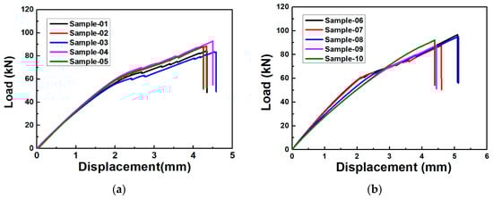 The phased specimens were used in the following tensile experiments to obtain their residual properties after the nondestructive micro-XCT damage detection. The obtained load-displacement curves of each sample, from 06–10, are shown in Figure 11b. With a contrast analysis against the load–displacement curves for typical tensile behavior (Figure 11a), one can see that the bilinear characterization stays consistent, while the variation of the five curves grows larger. The obtained residual properties compared with the typical properties are shown in Figure 12. The average value of tensile modulus witnesses a decrease of 7.66%, while the average value of tensile strength stays almost consistent. What calls for special attention is that the coefficient of variation changes, obviously, from 2.97% to 9.49% for the tensile modulus. Explanation for the CoV increase is that the phased damages provided a certain space for the yarns to deform. Various spaces of each specimen induced by the five damage levels resulted in various warp yarn deformations, furtherly leading to a larger variation and a slight decrease in tensile modulus. The tensile modulus showed a regular degradation with the damage level increase.