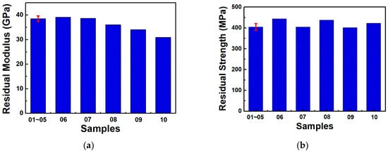 Residual modulus (a) and residual strength (b) due to the phased damages (samples 01–05 represent the initial typical values, while the samples 06/07/08/09/10 demonstrate the residual values).