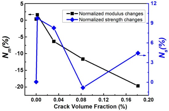 As discussed in Section 3.3, the crack volume fraction (CVF) was adopted to quantitatively characterize the inner damages induced by the phased tensile stress. To characterize the effect of microcracks on the tensile properties, the normalized properties changes vs. the CVF are shown in Figure 13, where the normalized modulus/strength changes are obtained by the following equation: