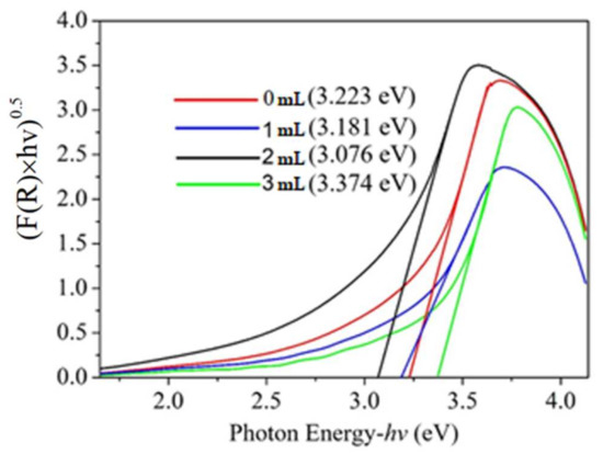 The TiO2 optical characteristics rely on the ionic radius of the dopant elements and the chemical properties of the dopants [23]. Mixed non-metal elements with TiO2 changes the energy states in the band gap, affecting the sunlight absorbance region and the electron transport of the TiO2 [24]. Figure 9 shows the band gap energy (Eg) as a function of mixing the Acac (0, 1, 2, and 3 mL) with a TiO2 mesoporous layer. For mixing the Acac with TiO2, the Eg value decreased to 3.181 eV (for 1 mL Acac) and 3.076 eV (for 2 mL Acac), respectively. The Eg of pure TiO2 is 3.223 eV, the transition from the valence band to conduction band, which attributes to the charge transfer transition from O2– to Ti4+. This value is in agreement with the TiO2 anatase particles. For the mixing the Acac with TiO2 sample, a lower Eg is 3.076 eV. However, the Eg increased to 3.374 eV with the increased Acac concentration. All specimens were very close to the studied Eg value of the anatase structure [23].