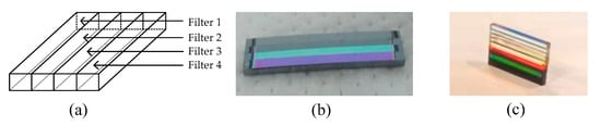The traditional spectral imaging system, such as dispersive prism system, diffraction grating system, and multiple camera system has a slow scan speed, a large size, and a high cost. However, the multichannel bandpass filter system has a smaller size, simplified structure and is lightweight. Multichannel bandpass filters played a crucial role in the multispectral imaging system. Figure 1 shows the schematic diagram of the filter. The width of a single channel is more than 0.5 mm and the joint width between two channels is more than 10 µm [4]. These kinds of filters are widely applied in the space spectral instrument [4]. The filter is firstly fabricated for every different passing band, and then the substrates are cut into long strips or other geometrical shapes, and finally glued together to obtain the multichannel filter. Owing to the precise cutting and adhesive bonding technique that are essential to this process, therefore, the degree of miniaturization is quite limited [5].