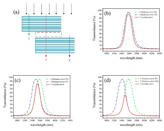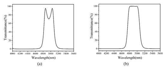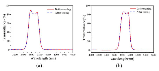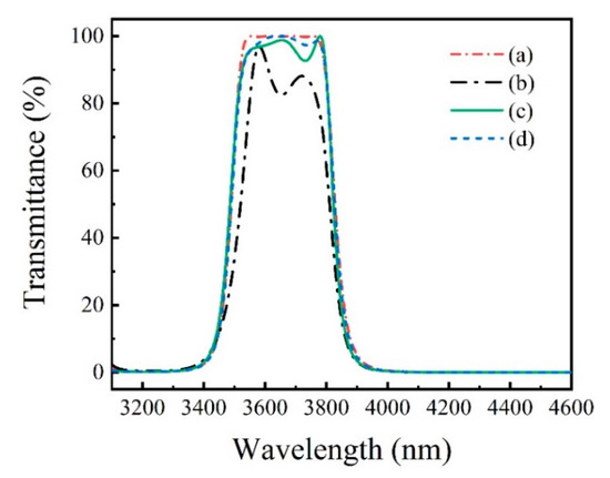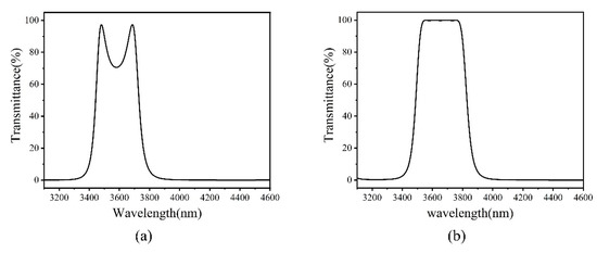 For further verification, two F-P filters were designed and shown in Figure 15a. Each filter consists of the same film structure HL 2H LH L HL 2H LH similar to our 3.55–3.75 µm filter structure, the reference wavelength is 3580nm, the thickness of space layer is 2H (optical thickness) for one filter and the thickness error of space layer was deliberately introduced for the other filter, the thickness of space layer is 1.9H (−5%),1.8H (−10%), respectively; the corresponding film structure is HL 1.9H LH L HL 1.9H LH, HL 1.8H LH L HL 1.8H LH, respectively. The peak transmission decreases from 91% to 55% and the bandwidth decreases from 208 to 136 nm.