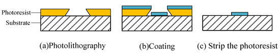 Quintel 4000-4 (QUINTEL, San Jose, CA, USA) lithography machine was used for exposure, negative photoresist NR7-6000PY ((Futurrex, Franklin, NJ, USA) and Resist Removers RR9 (Futurrex, Franklin, NJ, USA) were used in the lift-off process. NR7-6000PY has a high temperature resistance of 180 °C. Spin coater KW-4A (IMECAS, Beijing, China) was used to spin the photoresist. Zeiss GeminiSEM 500 (Jena, Germany) and Hitachi SU1510 SEM (Naka, Japan) were used to observe the cross-section of the sample. Nikon Eclipse LV150NA microscope (Tokyo, Japan) was used to observe the surface morphology. The ultraviolet irradiation was tested by homemade equipment.