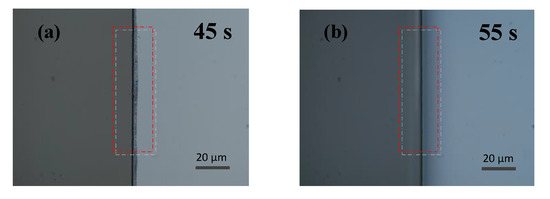Figure 9 gives the microscope photos of the two samples with different develop times. For negative photoresist, the insufficient develop time (50 s) causes the unexposed areas (especially in the marginal area) photoresist to not dissolve completely, which is also undesirable for the lift-off process. The develop time of 55 s is a suitable parameter for the lift-off process.