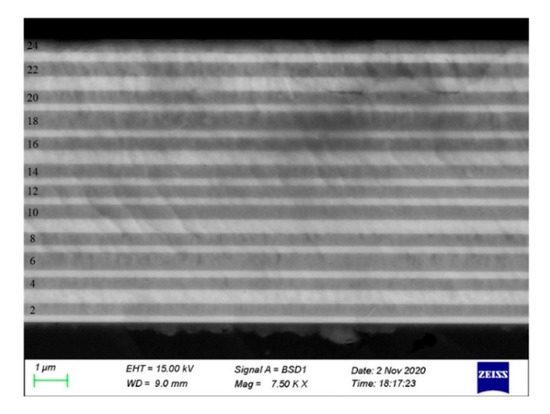 A cross-sectional SEM micrograph of filter structure is displayed in Figure 13. The layers are very homogenous and the interfaces are smooth and abrupt. This is the reason that the in-body scattering and surface scattering can be neglected. The details of the thickness differences of each layer are shown in Table 2.