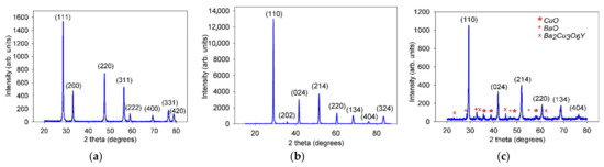 The X-ray diffraction (XRD) analysis of the obtained samples was carried out on a XRD-7000 diffractometer (Shimadzu, Kyoto, Japan) in a CuKα radiation and in an angle range of 2θ = 20°–80°. Data processing and phase identification were performed by comparing the XRD patterns obtained with those in the PDF-4 database (ICDD, Newtown, PA, USA, Release 2018). The specific surface area of the powders was determined by a BET volumetric method for low-temperature equilibrium sorption of nitrogen vapor from mixtures with helium using a TriStar 3000 vacuum sorption unit (Micromeritics, Norcross, Germany). Dilatometric measurements were carried out on the samples of materials compacted by a magnetic-pulse method, as described elsewhere [], using a DIL 402 C dilatometer (NETZSCH, Selb, Germany) in the heating mode up to 1500 °C and under subsequent cooling at a constant rate of 5 °C/min. The experiments were carried out in an air flow of 100 mL/min.