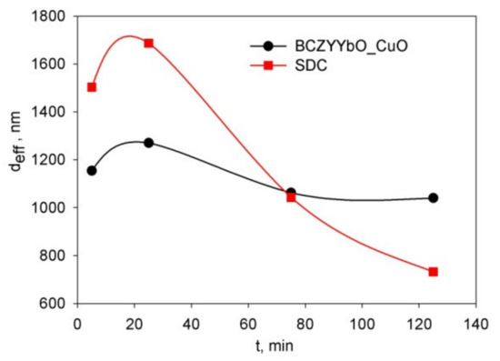 Schemes follow the same formatting. Dependence of the effective hydrodynamic diameter of aggregates, deff, in the suspensions of the BCZYYbO-CuO and SDC powders on the time of the ultrasonic treatment carried out under continuous cooling.