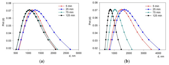Unimodal distributions of the aggregate size in suspensions after ultrasonic treatment for 5, 25, 75, and 125 min: (a) BCZYYbO-CuO; (b) SDC. Pint(d) is a probability density of unimodal distribution of aggregates by size.