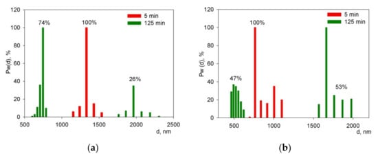 The results of studying the fractional composition for the BCZYYbO-CuO (Figure 5a) and SDC (Figure 5b) suspensions revealed that the initial suspensions (after UST for 5 min) BCZYYbO-CuO and SDC contained one fraction of aggregates with a size of 1325 and 755 nm, respectively. After UST for 125 min, the distribution of aggregates in both suspensions changed, namely, they became bimodal. A fine fraction of aggregates with a size of 745 nm (74%) and a larger fraction with a size of 1960 nm (26%) appeared in the BCZYYbO-CuO suspension. In the SDC suspension, the fractional composition was characterized by the presence of 492 nm (47%) and 1662 nm (53%) fractions.