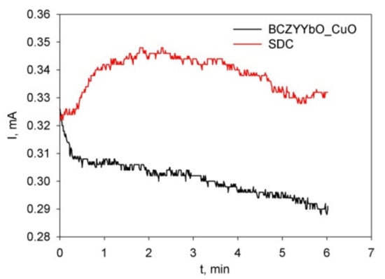For the EPD of the electrolyte layer from the suspensions of BCZYYbO-CuO (cell voltage 80 V) and SDC (cell voltage 60 V), the dependences of the current strength on time are shown in Figure 6. For the BCZYYbO-CuO suspension, there is a clear tendency to a decrease in the current strength with time, while the SDC suspension is characterized by an alternating change in the current with time-in the initial period of the process (up to 2 min) the current sharply increases and then gradually decreases with time (Figure 6).