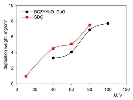 During the deposition of the BCZYYbO-CuO and SDC coatings the deposition voltage was varied from 10 to 100 V at a constant deposition time for 1 min (Figure 7). The dependences of the deposit weight for both BCZYYbO-CuO and SDC suspensions with increasing voltage had a nonlinear character of increase, close to S-shaped.