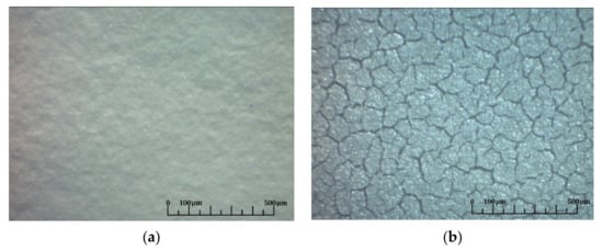 Figure 8 presents optical photographs of the EPD deposits obtained from the suspensions of the BCZYYbO-CuO (Figure 8a) and SDC (Figure 8b) powders. The deposit weight was 1.5 mg/cm2 (BCZYYbO-CuO) and 2.3 mg/cm2 (SDC). It can be seen that for both suspensions there was no formation of continuous deposited layers. Probably, this is due to the appearance of deposition instability when the levelling of the thickness of the deposited coating does not occur, and an island structure of the deposit is realized. Possible factors affecting the unevenness of the coating during deposition are uneven distribution of porous conducting channels of the non-conductive substrate, fluctuations in the electric field strength near the substrate surface, and the occurrence of electrohydrodynamic flows [,].