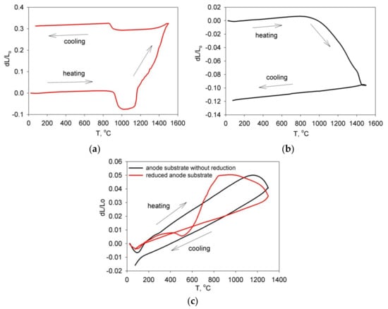 Figure 10 shows dilatometric curves for initial powder materials (Figure 10a,b) and anode substrates (Figure 10c). The material BCZYYbO-CuO (Figure 10a) is characterized by complex behavior during heating and subsequent cooling. When heated to a temperature of about 900 °C, thermal expansion of the material occurred, which was followed by short-term compaction in the temperature range of 900–1000 °C. Then a sharp expansion of the material occurred and continued until the end of heating up to 1500 °C, which may be associated with ongoing transformations in the material probably connected with incorporation of Cu into the lattice. Upon subsequent cooling, a slight shrinkage was followed by a slight expansion at a temperature of about 900 °C. The size of the BCZYYbO-CuO sample increased during the heating-cooling temperature cycle and the dL/Lo value was about +0.3. A sample of powder material SDC (Figure 10b) showed a different behavior: primary thermal expansion was followed by sintering and compaction of the material at temperatures of 800–1450 °C. Upon cooling, thermal contraction of the material occurred. There was a decrease in the size of the SDC sample during the heating-cooling temperature cycle and the dL/Lo value was about −0.12. For unreduced anode substrates (Figure 10c), compaction was observed in the temperature range from 1160 to 1300 °C. Cooling was accompanied by thermal contraction of the material. The reduced anode substrate (Figure 10c) experienced a sharp expansion, exceeding thermal expansion in the temperature range of 500–845 °C, which was followed by shrinkage when heated to a temperature of 1300 °C. Upon cooling, a uniform compression of the material occurred, and there was no total change in the dimensions during the temperature cycle. The revealed features of the behavior of the applied powder materials during heating and cooling can be a determining factor affecting the sintering process of the formed EPD coatings.