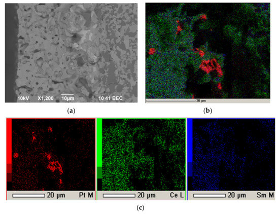 Figure 12 shows a cross-section of the SDC/Pt/NiO-SDC structure after final sintering at a temperature of 1500 °C for 5 h. It can be seen that the SDC electrolyte layer has a thickness of about 40 μm and is characterized by closed porosity (Figure 12a). The elemental composition of the SDC electrolyte is presented in a nominal ratio (Figure 12b,c). The platinum layer deposited on the NiO-SDC substrate was porous and had a thickness of about 20 μm. Platinum was not found in the composition of the electrolyte, and the deposited Pt sublayer had no tendency to diffusion smearing during sintering (Figure S2).