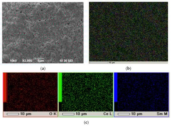 The surface of the SDC electrolyte layer after intermediate sintering at a temperature of 1450 °C for 5 h on the porous NiO-SDC anode substrate with a platinum sublayer: (a) SEM image; (b) integral map of the elements’ distribution; (c) individual element maps.