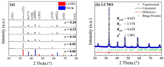 X-ray diffraction patterns of the samples with different NiO contents are depicted in Figure 1a. Standard XRD peaks for LCMO and NiO are illustrated in red and blue vertical lines, respectively. All samples exhibited a strong orientation towards (121) plane direction. This is contributed by the dominant plane orientation of their parent compound (LCMO). Minor peaks corresponding to NiO in the composites were observed and the relative peak intensity is gradually increased with the increasing NiO content. All peaks were indexed with LCMO and NiO phases, indicating the coexistence of the two chemically separated phases. Figure 1b illustrates the Rietveld XRD pattern of the pure LCMO phase. The blue circle is the diffraction data obtained from the experiment, the black solid line is the calculated result, the green vertical line represents the diffraction peak position of the LCMO phase, the red solid line is the difference between the experimental value and the calculated value. The experimental data are considered to fit well with calculated data as given by the low residual values of RWP and χ2. The refinement parameters of (1−x) LCMO: x NiO (x = 0.00, 0.05, 0.10, 0.15 and 0.20) are summarised in Table 1. There is no significant change in the lattice constants (a, b, c, V) of LCMO composites. This implies that NiO is segregated on the surface of LCMO grains or at the grain boundaries [14,23]. The average crystallite size, D was calculated by Scherrer’s equation below and gathered in Table 2: