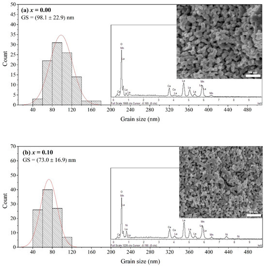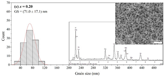 To analyse the addition of NiO nanoparticles on the microstructure of LCMO, the typical FESEM micrographs and grain size distributions of (1−x) LCMO: x NiO (x = 0.00, 0.10, 0.20) composites are shown in Figure 2a–c. Energy-dispersive X-ray (EDX) spectra are also included in Figure 2. The grain size distribution was depicted by 100 grains randomly picked from the FESEM micrographs. All samples were observed to compose with an irregular shape of grains, and it was found that the grain size of pure LCMO sample is in the range of 40–180 nm with 98.1 nm as the mean grain size. The average grain size of LCMO is ~3 times larger than its crystallite size, indicating the grain is consisting of several crystallites. The difference between grain and crystallite sizes is ascribed to the congregation or structure defects (vacancies, dislocations and stacking faults) of crystallite domains [24]. The grain size distribution is observed to skew to the left with the increasing NiO content. As a result, the mean grain size of samples reduced to ~70 nm with the addition of secondary phase (NiO). The reduction of average grain size in composites suggested that the NiO nanoparticle (<50 nm) was mainly segregated at the grain boundaries or on the surface of LCMO grains, which is in line with the XRD results. This also confirms the composite structure for the samples obtained in this work. The presence of La, Ca, Mn, O and Ni were confirmed by the EDX characterization and this supports the existence of NiO in the composites as demonstrated by the XRF results (not shown).