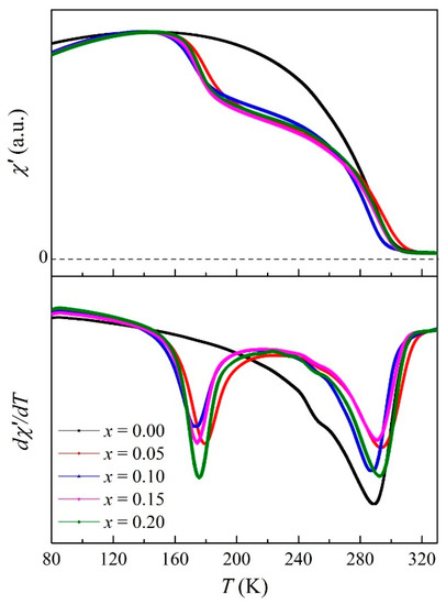 The magnetic properties of the samples were studied by the temperature dependence of AC susceptibility (ACS) measurement. All samples showed the ferromagnetic (FM)–paramagnetic (PM) transition as the temperature increases from 80 K to 330 K. The transition is demonstrated by a rapid drop of susceptibility until it reaches a minimum value (close to 0). The Tc can be identified from the inflection point of dχ’/dT versus T plot. Figure 3 shows the temperature dependence of the real part of AC susceptibility for LCMO:NiO composites. The TC of the pure LCMO was observed at 289 K and was denoted as TC1 in Table 2. This value is higher than the value reported by Xia et al. in La0.7Ca0.3MnO3 nanoparticle (268 K) [25]. The discrepancy can be attributed to the loss of long-range ferromagnetic ordering and the presence of magnetic disordered grain boundary layers in previously reported LCMO nanoparticles (<50 nm). The grain size of LCMO in this work is larger (98 nm), thus it has a higher value of TC [26,27]. The TC1 values recorded by the composite samples are in the range of 287–293 K. This indicates that the LCMO perovskite lattice remained intact, and no substitution occurred or formation of the new phase. The difference in TC of composites is insignificant by considering the FM–PM transition as an intrinsic and intragrain behaviour [28]. Nonetheless, there is an increase in the transition width and occurrence of TC2 for the LCMO:NiO composites. This can be ascribed to the presence of the antiferromagnetic material which is NiO nanoparticles at the grain boundaries and/or grain surfaces, where a similar behaviour was reported in La0.8Sr0.2MnO3:NiO composites [12]. Both TC1 and TC2 do not experience significant change with the increasing content of NiO. Therefore, we can deduce that LCMO and NiO still retain their individual magnetic phase in the composites and there is no interfacial reaction between these two phases.