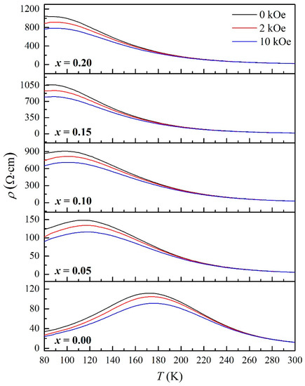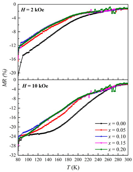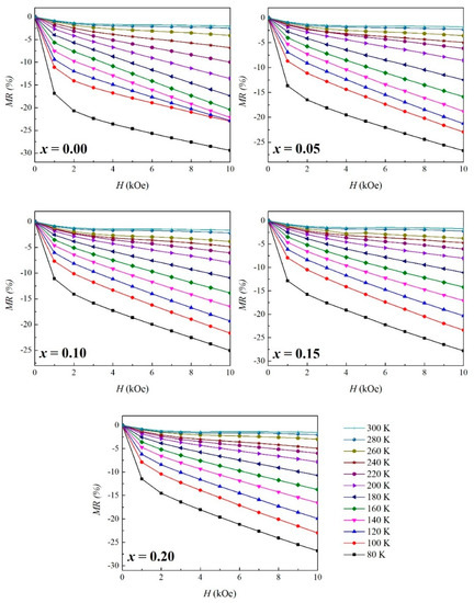 Figure 6 illustrates the MR (%) as a function of external applied magnetic field (0–10 kOe) curves from 80–300 K for (1−x) LCMO: x NiO, x = 0.00, 0.05, 0.10, 0.15 and 0.20. The MR (%) is defined by Equation (4):