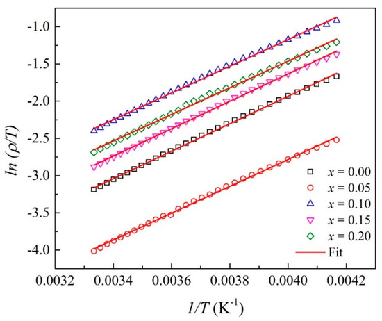 where is the temperature-independent coefficient, is Boltzmann’s constant and is the activation energy of the polaron. Figure 5 shows the graph of ln (ρ/T) against 1/T. The plot followed a linear relation at the high-temperature region and the obtained parameters are summarised in Table 3. The good fit between our data and the SPH model demonstrates that the conduction mechanism for the LCMO:NiO composites in the high-temperature region is mainly contributed by the hopping process of small polaron. As shown by the previous studies, the in SPH is related to the height of the phase boundaries [40,41]. It is interesting to point out that the values calculated for the LCMO:NiO composites in this work do not show a significant change with the increasing NiO content. This is contradicted with the previous works as the magnetic disorder in the secondary phase will dominate the conduction process and leads to a higher resistive phase boundary, so a higher is required for the higher concentration of the secondary phase [17,18]. However, the SPH model still accords well with the conduction mechanism in the high-temperature region. Hence, the scattering mechanism in the metallic region can be sufficiently described by the theoretical models as the resistivity data were well fitted with Equations (2) and (3).