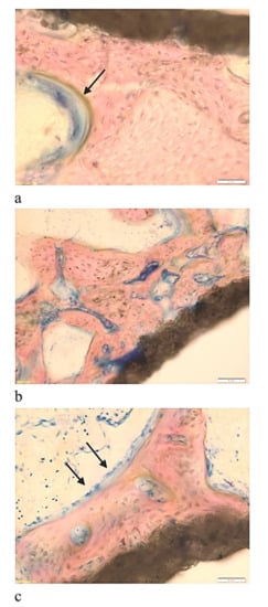 Histological sections of a Ti-HA + BMSC + PRP implant after 2 weeks. Stain: Stevenel’s blue and Van Gieson’s picro-fuchsin. Magnification 20×. Calcified bone stains a bright pink. Osteoid stain bright green; osteoblasts stain blue. (a) Osteoid-like tissue layer (dashed arrow); (b) Extensive new bone formation as osteoblast-like cells; (c) Cuboidal osteoblast-like cells (continuous arrow).
