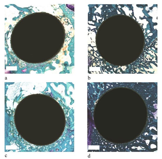 Histological images at 2 weeks: (a) Ti-HA; (b) Ti-HA+ BMSC; (c) Ti-HA + PRP; (d) Ti-HA + BMSC + PRP. Toluidine Blue, Acid Fucsin, Fast Green staining; magnification 2.5×.