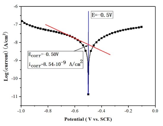 Figure 1 shows the potentiodynamic polarization curves of the coatings in a 3.5 wt.% NaCl solution. Using the Metrohm Autolab Nova 2.1 analysis software of MULTI AUTO M204 electrochemical work station, the corrosion dynamics parameters were derived from the approximate cathode Tafel region (ranging from −120 to −60 mV versus the corrosion potential []) and extrapolated back to the corrosion potential (as shown in Figure 2). The results are listed in Table 2. The corrosion current density (icorr) related to the corrosion rate, and a lower icorr indicated better corrosion resistance. Rp reflected the coating’s ability to block electrolyte penetration; the larger the Rp, the stronger the coating system’s blocking effect on corrosion ions. It shows that PE (pure epoxy coating) coating has the largest icorr and smallest Rp. Compared with PE coating, icorr of TEOS-PE coating and GPTMS-PE coating decreased from ~10−9 to ~10−10 A/cm2, Rp increased from ~106 to ~107 Ω; icorr of BISE-PE coating decreased from ~10−9 to ~10−11 A/cm2, and Rp increased from ~106 to ~108 Ω, indicating that bis-silane prepolymer-modified epoxy/polyamide system coating has the best corrosion resistance.