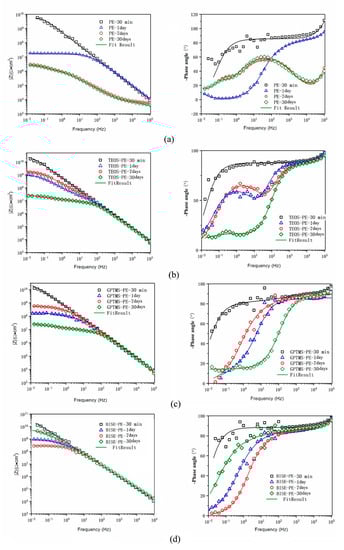 Typical Bode plots of pure (a), TEOS−modified (b), GMTPS−modified (c), and bis−silane (d) modified epoxy coatings on Al-alloy during immersion in a 3.5 wt.% NaCl solution.