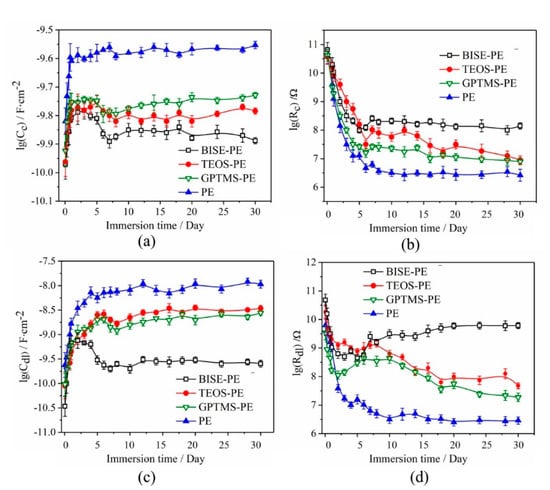 During the whole immersion test period, the Cc values of silane prepolymer-modified coatings are much lower than that of PE coating, indicating that the silane prepolymer-modified coatings can improve the barrier effect of coating on water. The BISE-PE coating had the lowest Cc value (Figure 5a), and highest Rc value (Figure 5b), indicating that the BISE-PE coating has the strongest penetration barrier ability []. The order of the stable Cdl values of the four coatings was: PE> TEOS-PE > GPTMS-PE > BISE-PE, and the order of Rdl from small to large is: PE < GPTMS-PE < TEOS-PE < BISE-PE, indicating that the BISE-PE coating could effectively inhibit the corrosion reaction at the coating/metal interface.
