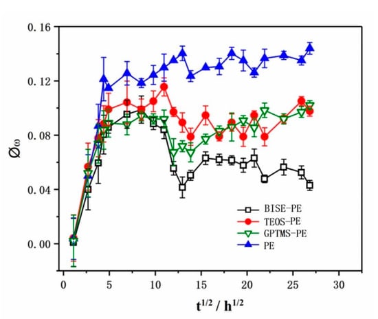 Figure 6 shows the evolution of water sorption of four coatings during the immersion test time. It can be seen that compared with PE coating, the water absorption of silane-modified coatings had been greatly reduced, especially the BISE-PE coating decreased by ca.50%. The sharp decrease in water absorption of BISE-PE coating may be due to the polymer leaching and/or crosslinking reaction between silanol and epoxy groups [,,].
