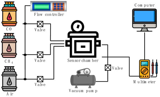The gas sensing characteristics of the samples were measured in a home-made chamber for CO and CH4 gas at room temperature in a continuous gas flux mode. Gases were injected into the chamber separately through a precision leak valve and the gas concentration was regulated by mass flux controllers adjusting the flow rates of gases. The flow inside the chamber was set to 1 bar with a gas flux of 50 mL/min and a gas concentration of 3000 mg/m3. During the experiments, gas sensor tests were performed at a relative humidity (RH) of 40(10)%. Sensor conductance measurements were normalized by the response recorded without gas under a base pressure around 10−2 mbar into the chamber. A multimeter from Keithley instruments (Model 6514, Cleveland, OH, USA) was employed to collect the resistance measurement applying a bias voltage of 10 V. A scheme representing the experimental setup used for gas sensor measurements in real time is shown in Figure 1.