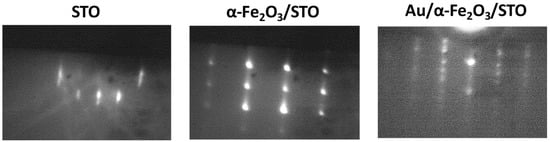 During the growth process of both α-Fe2O3 and Au layers by pulsed laser deposition, in situ RHEED technique was employed to monitor their crystalline character. From the initial stages of deposition, intense patterns were observed. Figure 2 shows representative RHEED patterns of the clean STO(111) substrate and those of α-Fe2O3 thin film grown on STO(111) and Au islands grown on α-Fe2O3/STO(111) system at the final growth stages. In both Au and α-Fe2O3 layers, the RHEED patterns show smooth diffraction stripes, related to the growth of homogeneous and crystalline films.