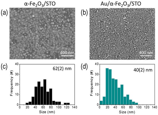Figure 3 shows the SEM images and the distribution analysis of particle size for α-Fe2O3 thin film and Au/α-Fe2O3 bilayer prepared on oxide STO(111) substrate. α-Fe2O3 thin film grown on STO(111) (Figure 3a) shows a homogeneous coverage of particles with an average size about 62(2) nm (Figure 3c), identifying an island-type growth. The greater interaction of α-Fe2O3 atoms with those of the STO substrate generates the formation of a α-Fe2O3 layer with a nanoparticulate character in order to minimize the system free energy. For the case of the Au/α-Fe2O3 bilayer, a nanostructured top layer related to the formation of Au islands is obtained on α-Fe2O3/STO(111) system. Au islands also show a homogeneous coverage on α-Fe2O3 surface, with an average particle size of 40(2) nm (see Figure 3b,d). This type of growth is induced during the Au growth when the sample substrate is kept at a temperature of 250 °C, as was identified previously in [], inducing an island-type growth of Au promoted by the surface diffusion. The phenomenon is attributed to a dewetting process by a one-step procedure, instead of the usual methodology based on the post-annealing of the metallic film [,,,,,]. Specifically here, the α-Fe2O3 surface presents a particulate character with a discontinuous profile, which generates a more heterogeneous stress distribution than in a flat surface. These features of the bottom layer favor the nucleation of Au holes and the formation of larger and more separated Au islands in order to minimize the interface energy of the system [], with qualitative similar final results. The average height for both α-Fe2O3 and Au layers was also determined on equivalent samples in our previous works to be 2.3(4) nm and 6(1) nm, respectively, by atomic force microscopy (AFM) and GIXRD [,].