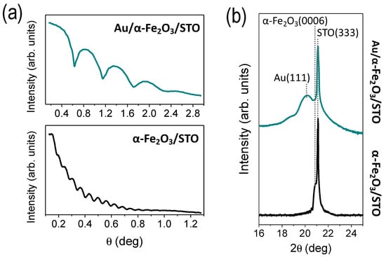 To analyze the in-plane and out-plane crystalline growth of the Au and α-Fe2O3 layer, high resolution GIXRD, XRR, and reciprocal space map (RSM) measurements were performed. From low angle XRR measurements of the α-Fe2O3 layer and Au/α-Fe2O3 bilayer deposited on oxide STO(111), shown in Figure 4a, the thicknesses of the layers were estimated using the period of the oscillations. A thickness of 28(2) nm for the α-Fe2O3 layers and 6(1) nm for the Au layer was obtained. Representative high angle XRR measurements for the α-Fe2O3 layer and Au/α-Fe2O3 bilayer grown on STO(111) substrates are shown in Figure 4b. In the α-Fe2O3/STO(111) system, in addition to the diffraction peak corresponding to the STO(111) substrate, the presence of α-Fe2O3 with (0001) orientation as a single phase is identified, which is not clearly recognized in the diffraction pattern of the Au/α-Fe2O3 bilayer. In the case of the Au/α-Fe2O3 bilayer, the Au nanostructured layer on top of the α-Fe2O3 layer is recognized as a wide peak at lower 2θ values than the diffraction peak related to the α-Fe2O3 layer, which corresponds to epitaxial Au with a (111) orientation and is responsible for masking the diffraction peak signal related to the epitaxial α-Fe2O3 layer. It should be pointed out that some Kiessig fringes around the layer Bragg peaks can be noted, indicating the occurrence of high quality and smooth surfaces with abrupt α-Fe2O3/STO substrate and Au/α-Fe2O3 interfaces. These results are in agreement with results reported in [].
