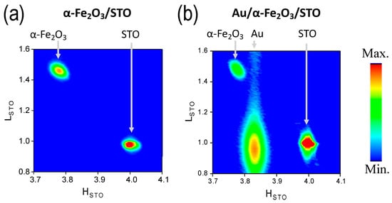 LH reciprocal space maps (RSM) for (a) α-Fe2O3 layer grown on STO(111) substrate and (b) Au/α-Fe2O3 bilayer prepared on STO(111) substrates. An incommensurate epitaxial growth is identified from a non-coincidence of Au(111), α-Fe2O3(0001), and STO(111) substrate in-plane peaks (marked in each figure). The color scale corresponds to the signal intensity.
