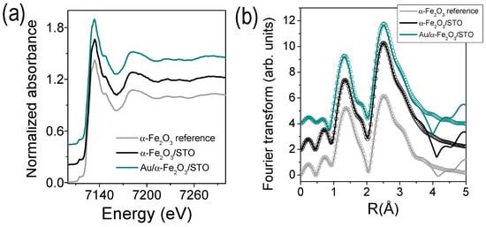 Possible α-Fe2O3 modifications at short-range order during the growth of Au nanoparticles or amorphous minority phases non identified by GIXRD are analyzed by XAS experiments, as Figure 6 shows. Both X-ray absorption near-edge structure (XANES) and extended X-ray absorption fine structure (EXAFS) measurements were performed. Absorption profiles obtained by XANES measurements at the Fe K-edge of heterostructures follow the absorption features of powder α-Fe2O3 reference (see Figure 6a). Fitting the XANES spectra by a linear combination of different iron oxide reference compounds (Fe, FeO, Fe3O4 and α-Fe2O3 references) [,] (not shown here) confirms an oxidation state of Fe3+ and a 100% of α-Fe2O3 phase in both α-Fe2O3 layer and Au/α-Fe2O3 bilayer grown on STO(111) substrates, corroborating the α-Fe2O3 phase as a single iron oxide phase before and after the epitaxial deposition of Au islands.