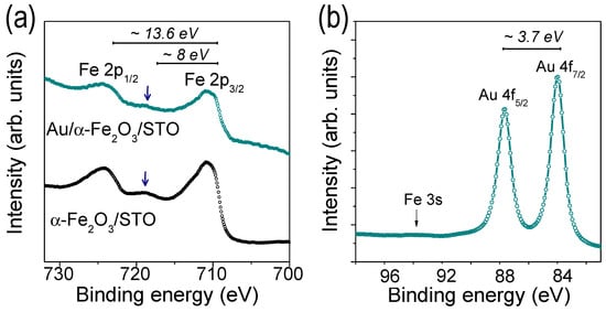 XPS measurements performed on the (a) Fe 2p core level of the α-Fe2O3 layer and the Au/α-Fe2O3 bilayer grown on STO(111) substrates and (b) Au 4f core level of the Au/α-Fe2O3 bilayer grown on STO(111) substrate. Lower signal is collected on the Fe 2p core level for the Au/α-Fe2O3 bilayer than for the α-Fe2O3 layer.