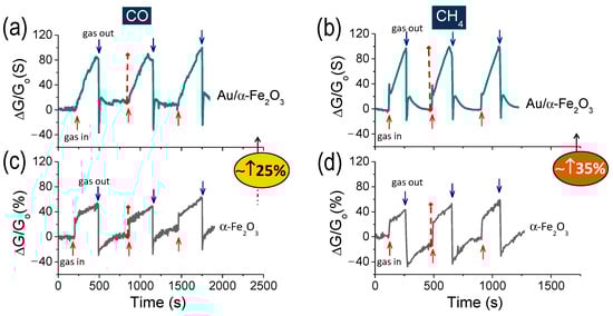 The sensibility of the α-Fe2O3 layer and complex Au/α-Fe2O3 bilayer as gas sensing materials under CO and CH4 gas atmospheres at room temperature is shown in Figure 8. For that, the relative conductance response (ΔG/G0) of the complex Au/α-Fe2O3 system is compared in each case with the results obtained for the single α-Fe2O3 layer deposited on the STO(111) substrate under the same conditions. In each case, the gas sensor sensibility is determined by the gas in–gas out difference from the ΔG/G0 curves. α-Fe2O3 is a n-type semiconductor and its gas response involves the formation of an electron depletion layer at the surface and the return of these electrons to the conduction band, increasing the conductance signal after exposure to reducing gases [,,].