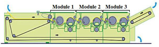 Then, the fibrous material was treated using a Laroche Cadette 1000 “all fibre” extraction device (Laroche, Cours, France). This industrial equipment was used to extract fibres in a mechanical way, and it is presented in Figure 1. With a 1 m width, this machine allowed the treatment of a 175 kg/h inlet flow rate of the fibrous material collected at the outlet of the vertical breaking rollers, corresponding to a 3.5 m/min speed for the feed belt.