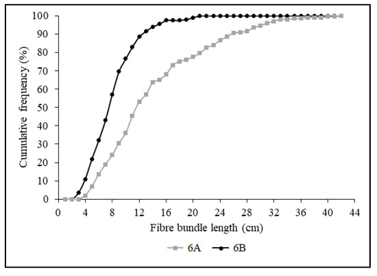 Additionally, Figure 2 perfectly illustrates the fact that process A is more accurate for better preservation of fibre length, and this was true for all six batches tested in this study, even though Figure 2 only shows the results obtained from batch number 6. Only 13% and up to 32% fibre bundles extracted from batch number 6 were observed less than 6 cm in length for processes A and B, respectively, which is interesting for further spinning stages. Portions of 36% and 76%, respectively, of fibre bundles were less than 10 cm in length, and at least half of the fibre bundles (i.e., 50% and 62%, respectively) had a length comprised between 6 and 14 cm, which should be really interesting for subsequent spinning.