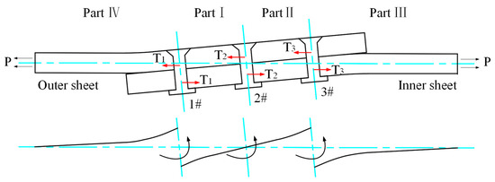 Structural deformation is a gradual process. In the outer sheet, the maximum deformation occurs in the vicinity of Rivet 1#. The minimum deformation appears at Rivet 3#. Conversely, in the inner sheet, the maximum deformation occurs in the vicinity of Rivet 3#. The minimum deformation appears at Rivet 1#. Therefore, the interface of Part IV and Part I in the outer sheet as well as the interface of Part II and Part III in the inner sheet are the most dangerous areas of a three-row riveted lap joint. Since the interfaces have the minimum section surface area, the interfaces suffer to the total tensile load P.