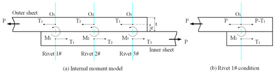 Likewise, the internal moments in the second and third rivet rows can be represented by Equations (7) and (8).