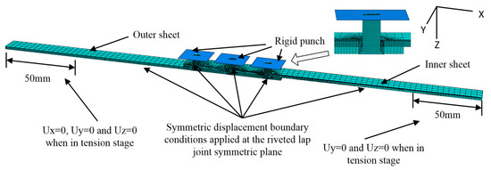 Figure 2 illustrates the regional structure deformation of a riveted lap joint. The riveted lap joint can be considered as a symmetrical structure. The dimension and rivet hole layout of the outer sheet keep the same as the inner sheet.