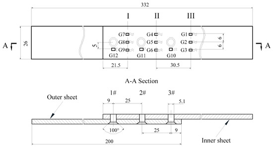 Figure 2, the three-row riveted lap joint can be divided into four parts. Different parts suffer different proportions of tensile load. The proportion of tensile load transmitted by each part is closely related to the three rivets. The micro-strain gauges capture the strain variations of each part during the tensile test. The data shown in