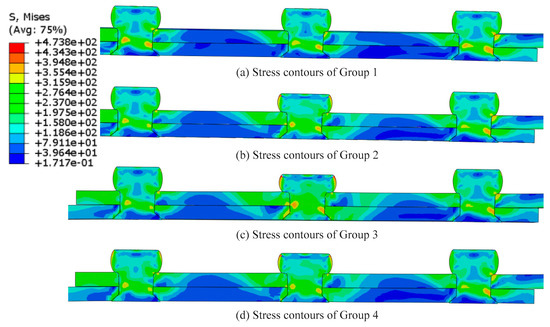Figure 8 illustrates the stress contours of the riveted lap joints after riveting and tension processes. As can be seen, the max stress of Rivet 2# is smaller than that of Rivets 1# and 3#. Additionally, at the same time, Rivet 2# in Group 1 carries minimum load compared with Rivet 2# in other groups. The stress concentration region of the outer rivets is highlighted in Group 1. The stresses of Rivet 2# in Group 2 and Group 4 become larger. Meanwhile, the stresses of Rivets 1# and 3# in Group 2 and Group 4 become smaller. The tension load distribution, in these cases, would tend to be more homogeneous. The stress of Rivet 2# in Group 3 is too big since the squeezing displacement of Rivet 2# is larger than any others. A new stress concentration region appears in Group 3.